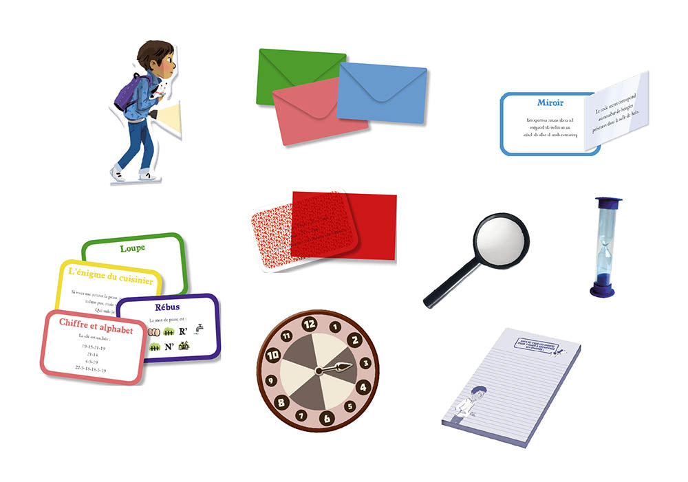 - des accessoires de détectives pour décoder les énigmes : loupe, carte miroir, morse, filtre rouge