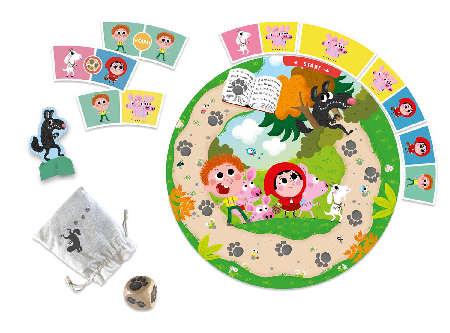 Contenu : 1 pion Loup, 1 sac en toile, 1 gros dé en bois, 1 plateau de jeu recto verso, 22 dominos.