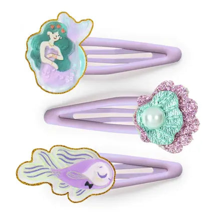 Apportez une touche féérique à votre coiffure avec ce set composé de 3 barrettes en métal ornées d’une sirène et d’un poisson en acrylique, ainsi que d’un coquillage en simili-cuir.