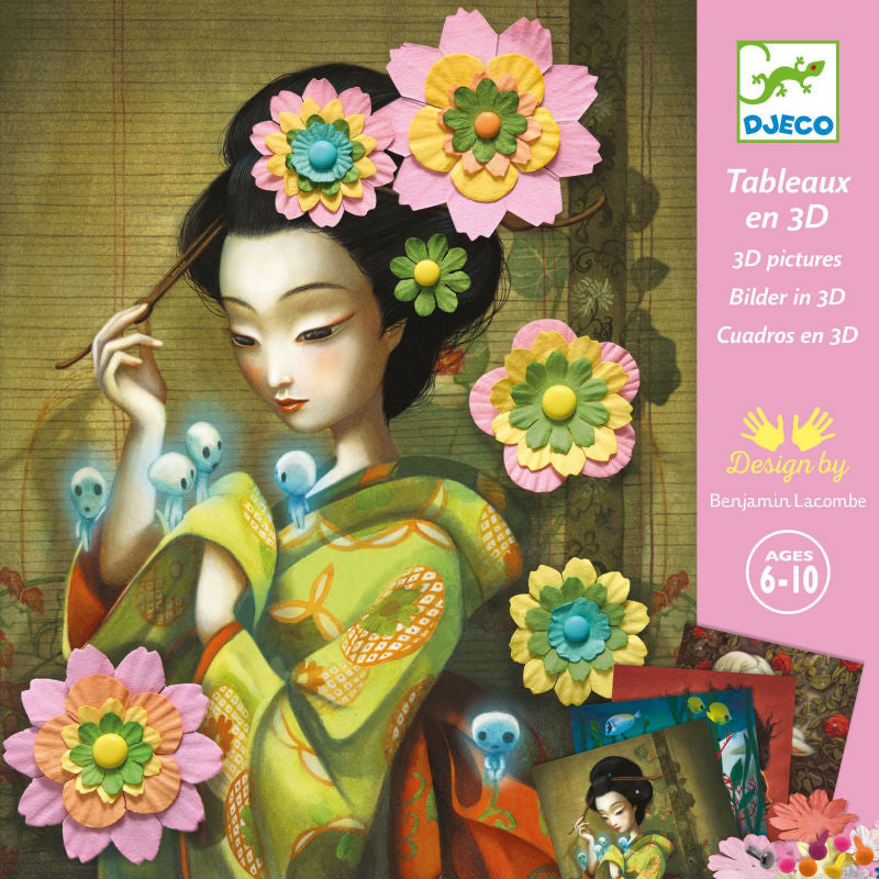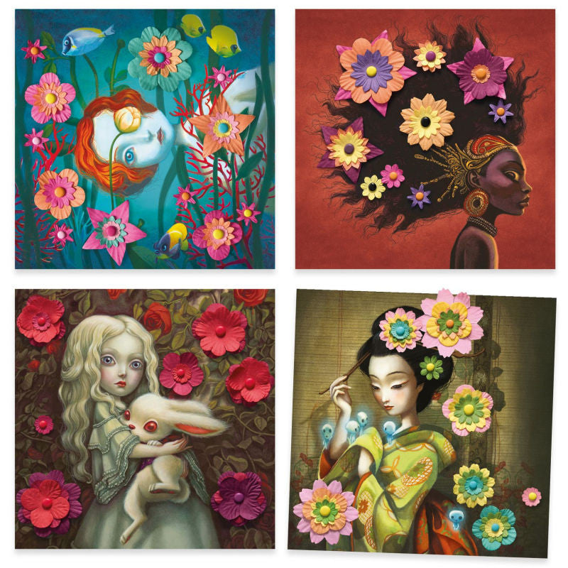 Pour compléter les 4 tableaux de Benjamin Lacombe, l’enfant dispose d’une multitude de corolles de papier qu’il assemble facilement grâce aux jolies attaches parisiennes colorées. De magnifiques fleurs de toutes sortes viennent embellir les portraits de 4 héroïnes sublimes et mystérieuses. Un univers illustré fort qui séduira petits et grands...