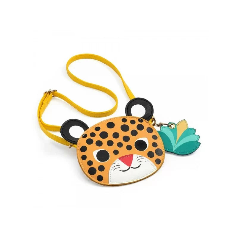 Un sac bandoulière illustré d’une adorable tête de guépard et son mini porte-monnaie en forme de fleur de lotus en simili cuir. L’enfant le porte sur son épaule grâce à l’anse ajustable.