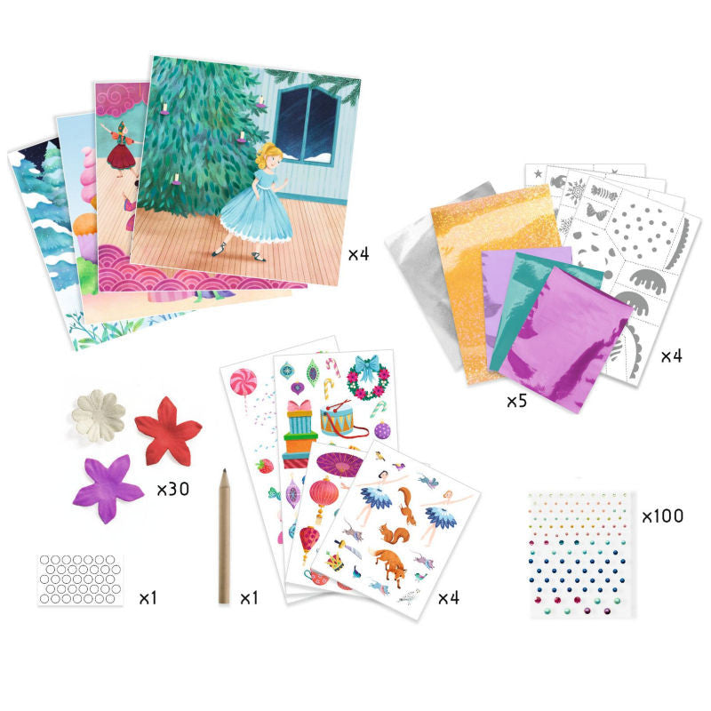 L'enfant vient embellir chaque tableau du célèbre conte de l'écrivain prussien E.T.A. Hoffmann "Le Casse-Noisette", publié à Berlin en 1816, à l'aide de décalcomanies, de fleurs en papier, de strass autocollants et de motifs à métalliser. Soit 4 activités réunies dans un même coffret, pour un résultat épatant !