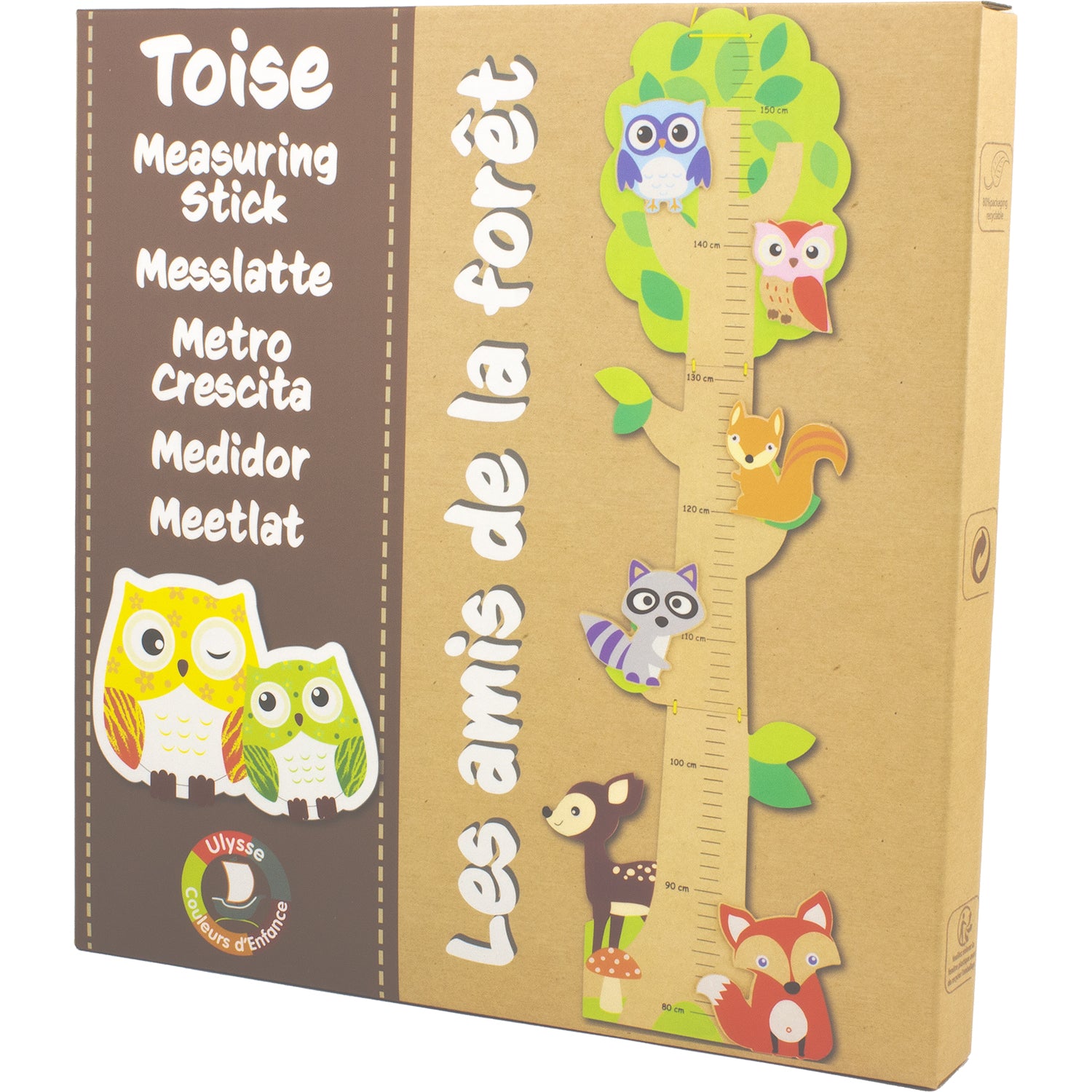 Présentée pliée dans une boite avec fenêtre (28 x 27 x 3 cm). Pour fixer la toise au mur, penser à placer la base de la toise à 78 cm du sol. Ainsi la toise permet de se mesurer de 80 cm à 1m55.