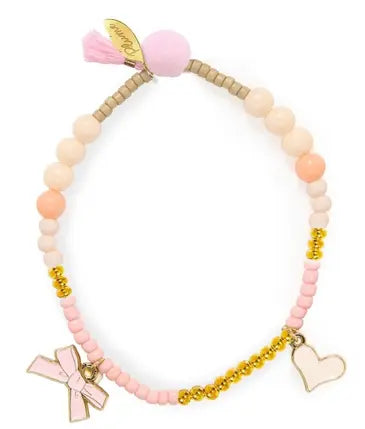 Plongez dans l'univers gracieux de la danse avec ce bracelet orné de perles en acrylique, de deux charms en métal émaillé représentant un ruban et un cœur, ainsi que d’un pompon en polyester et d’un pompon gland en coton. Il apporte une touche délicate et poétique à votre poignet. Son double fil élastique assure une solidité optimale tout en garantissant un enfilage facile, sans fermoir.