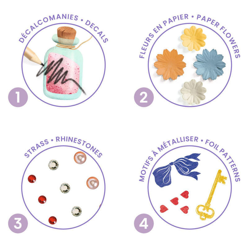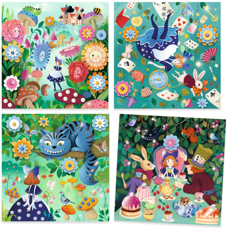 L'enfant vient embellir chaque tableau du célèbre récit du romancier britannique Lewis Carroll à l'aide de décalcomanies, de fleurs en papier, de strass autocollants et de motifs à métalliser. Soit 4 activités réunies dans un même coffret, pour un résultat épatant !