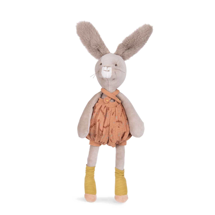 Avec sa frimousse à moustaches et ses grandes oreilles toutes douces, cet adorable lapin à la salopette ocre ne demande qu'à faire des câlins ! Compagnon de jeu la journée et doudou protecteur la nuit, il accompagnera bébé.