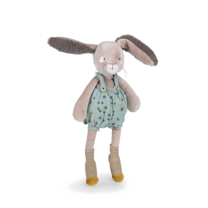 Avec sa frimousse à moustaches et ses grandes oreilles toutes douces, cet adorable lapin à la salopette sauge ne demande qu'à faire des câlins ! Compagnon de jeu la journée et doudou protecteur la nuit, il accompagnera bébé.