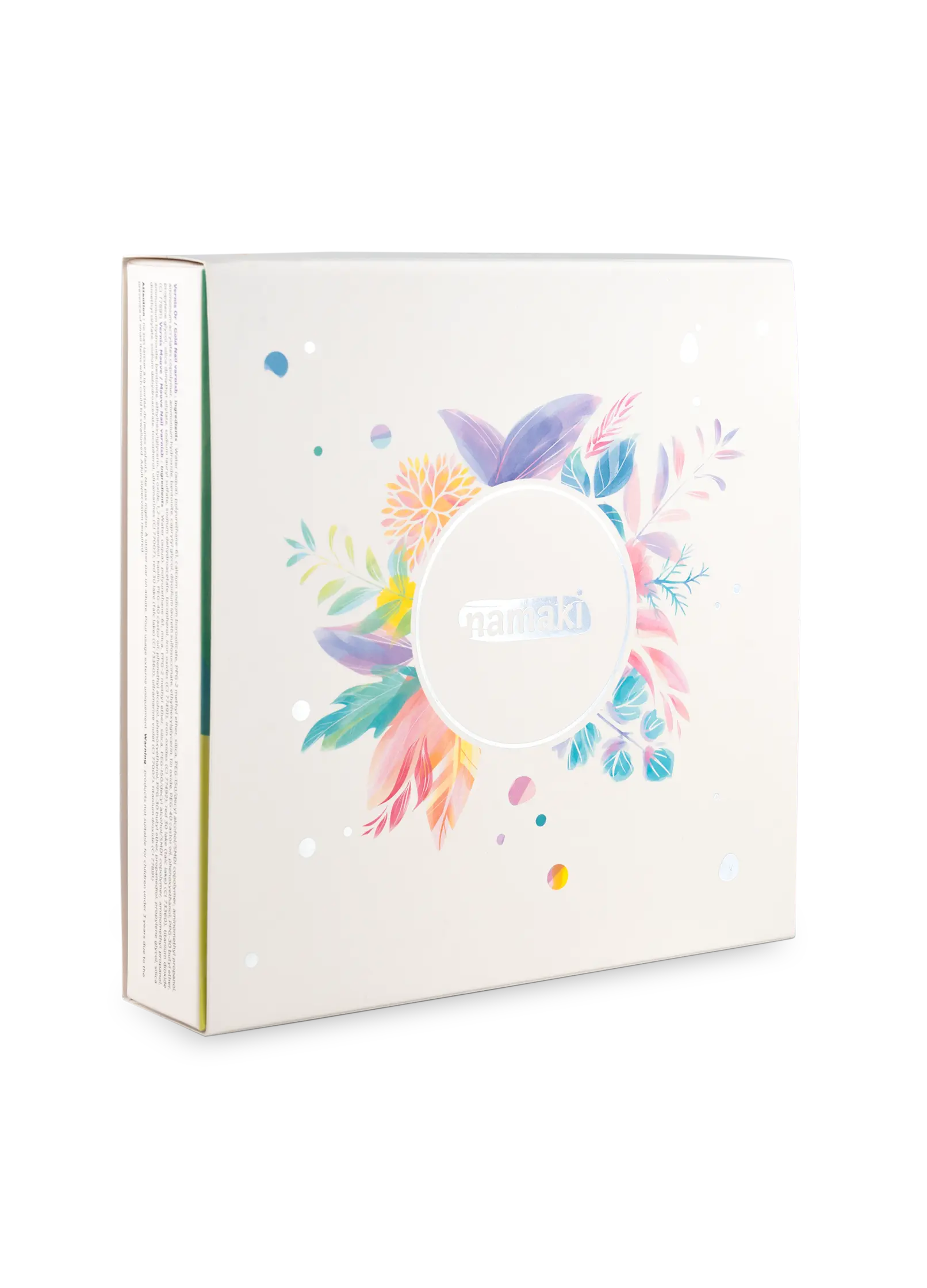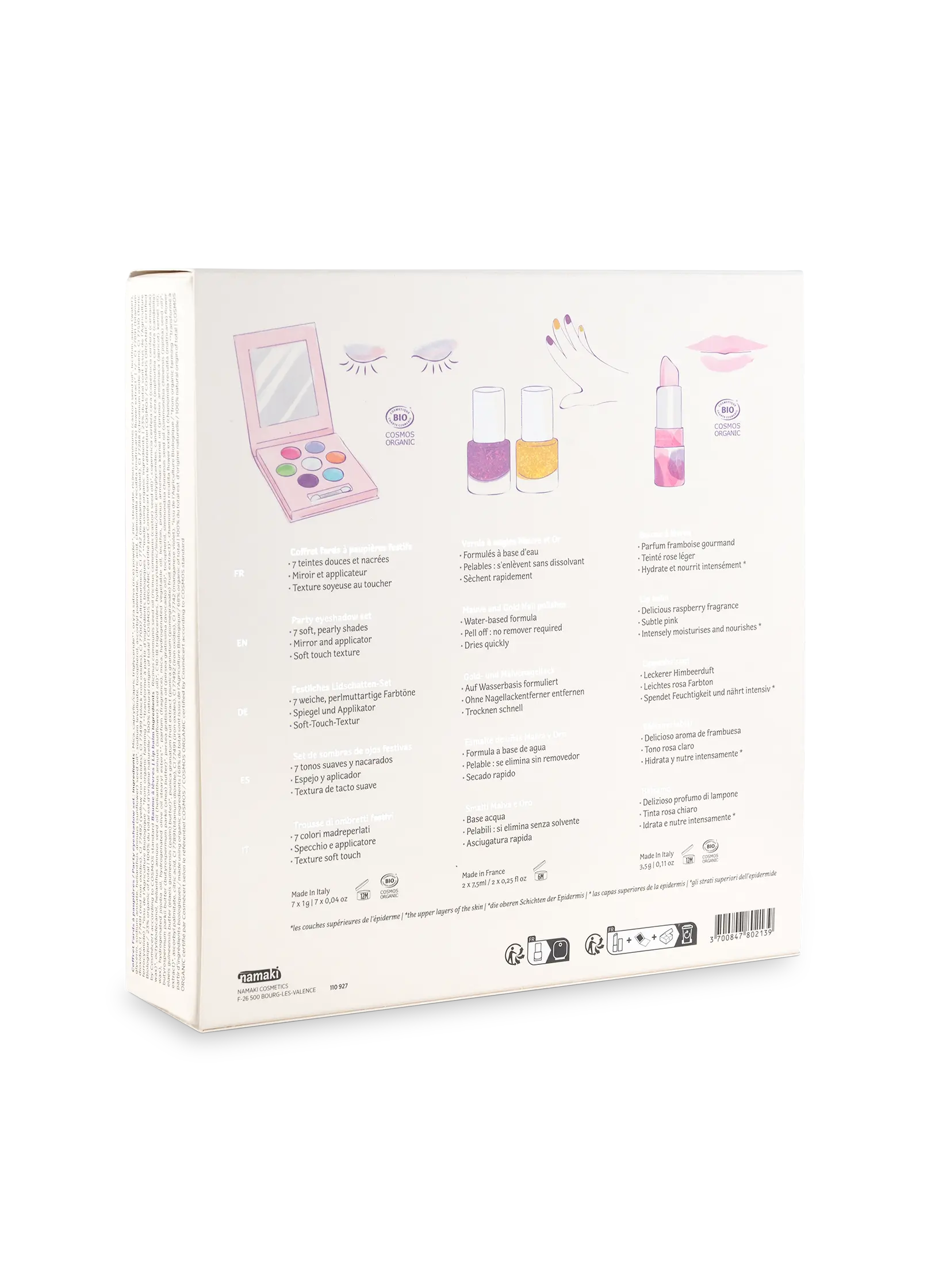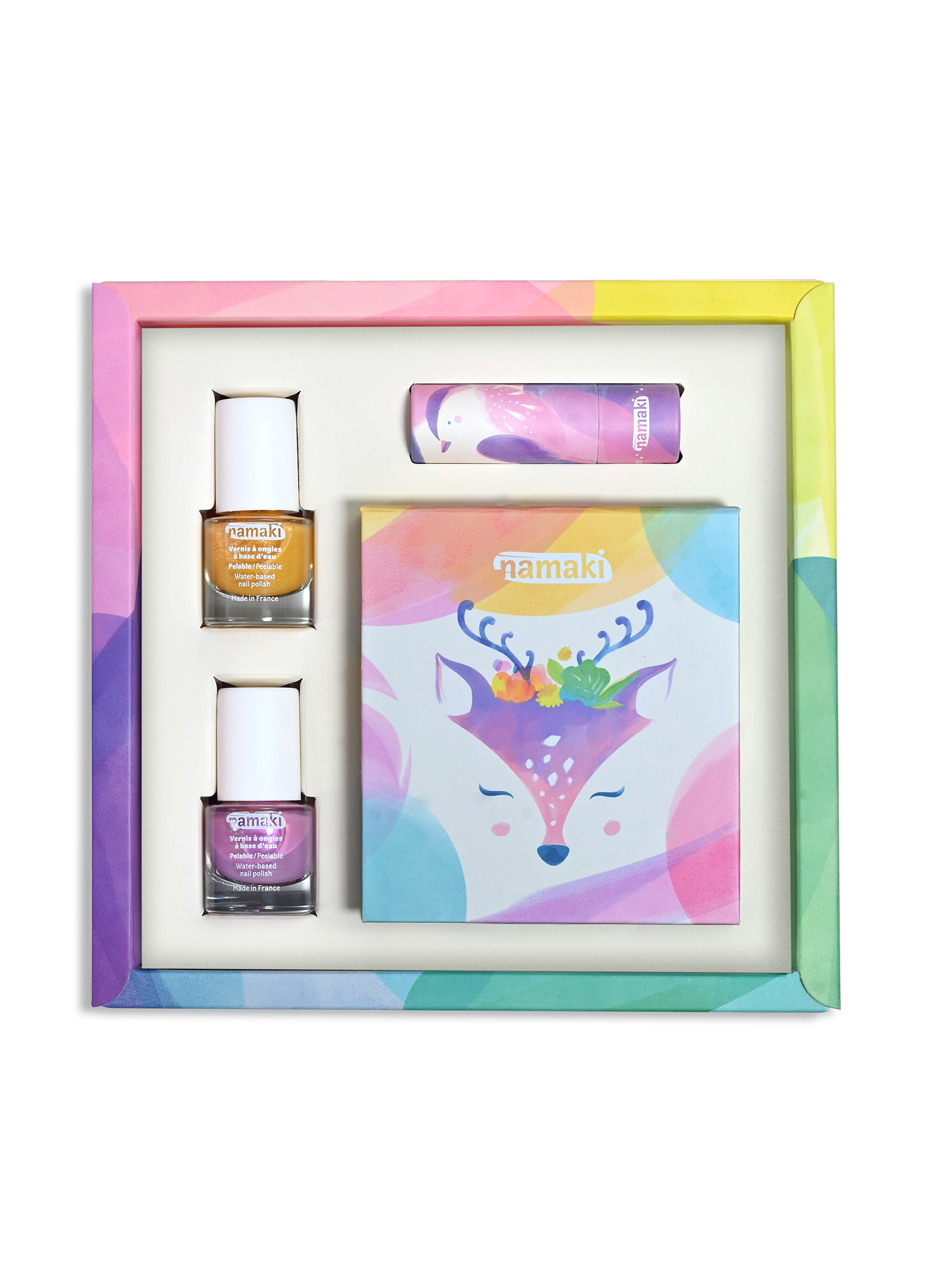 Au creux de ce coffret étincelant se niche deux teintes de vernis à ongles que l’on peut alterner selon son humeur ou mixer pour un effet Whaou, une palette de 7 fards à paupières pour sublimer votre regard de jolies teintes nacrées et un baume à lèvres teinté d’un rose léger au parfum gourmand de Framboise qui gardera vos lèvres douces. Faites le plus beau des cadeaux pour développer l’imaginaire de vos enfants et emmenez-les vers un conte de fées rempli de paillettes et de poésie.