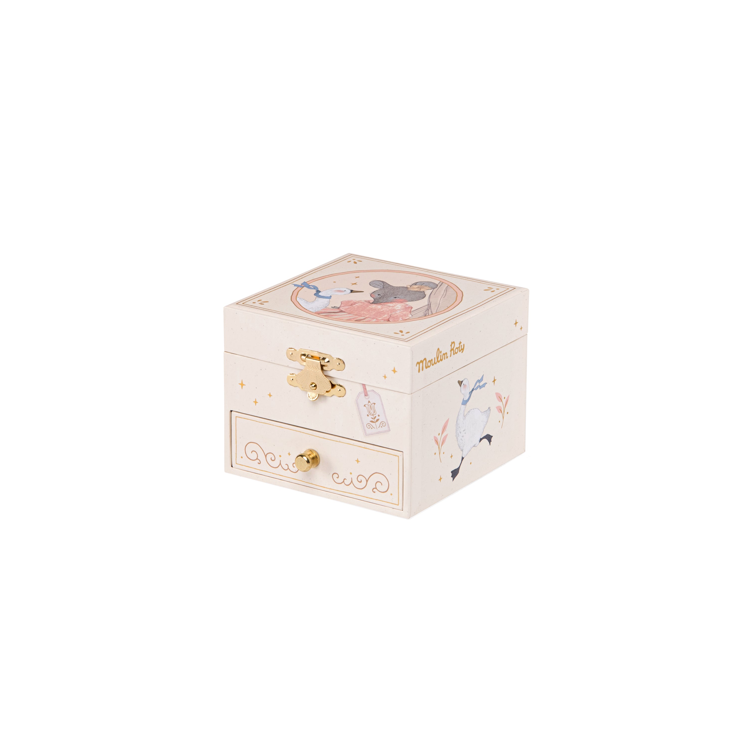 Boîte à musique coffret illustrée, avec petit tiroir pour y ranger ses précieux secrets... Ouvre la boîte et regarde virevolter la ravissante petite souris danseuse sur une douce mélodie... Il y a même un miroir pour s'admirer.