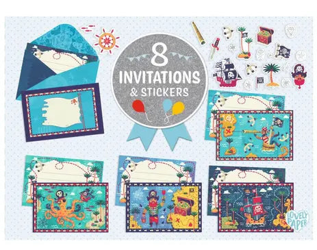 Découvrez les cartes d'invitation Tous à bord de Lovely paper by Djeco, un coffret de papeterie aux effets métallisés renfermant des cartes d'invitation illustrées sur le thème des pirates, des enveloppes assorties et des planches de stickers pour personnaliser chaque message.