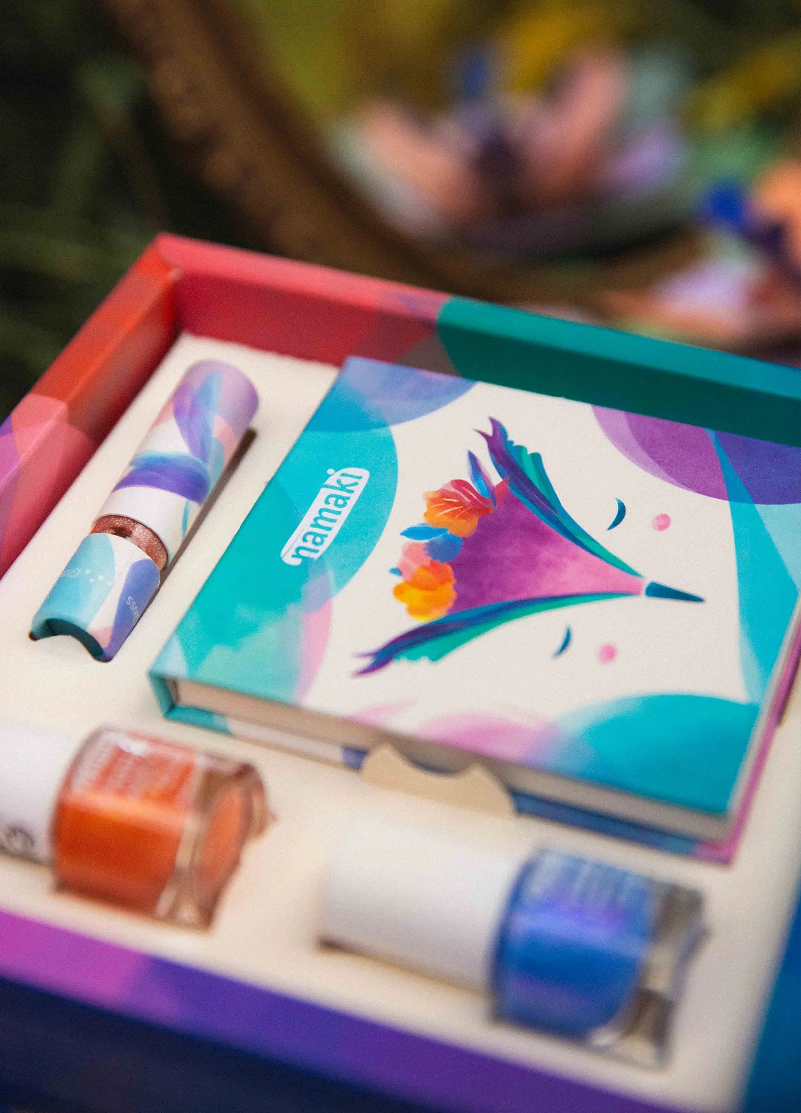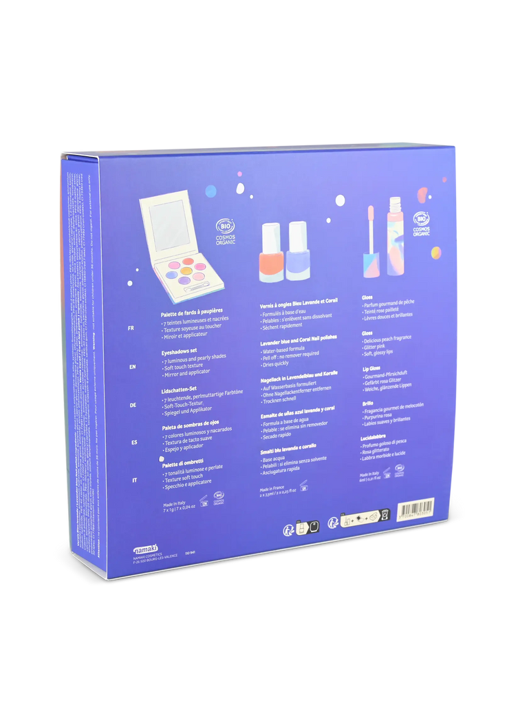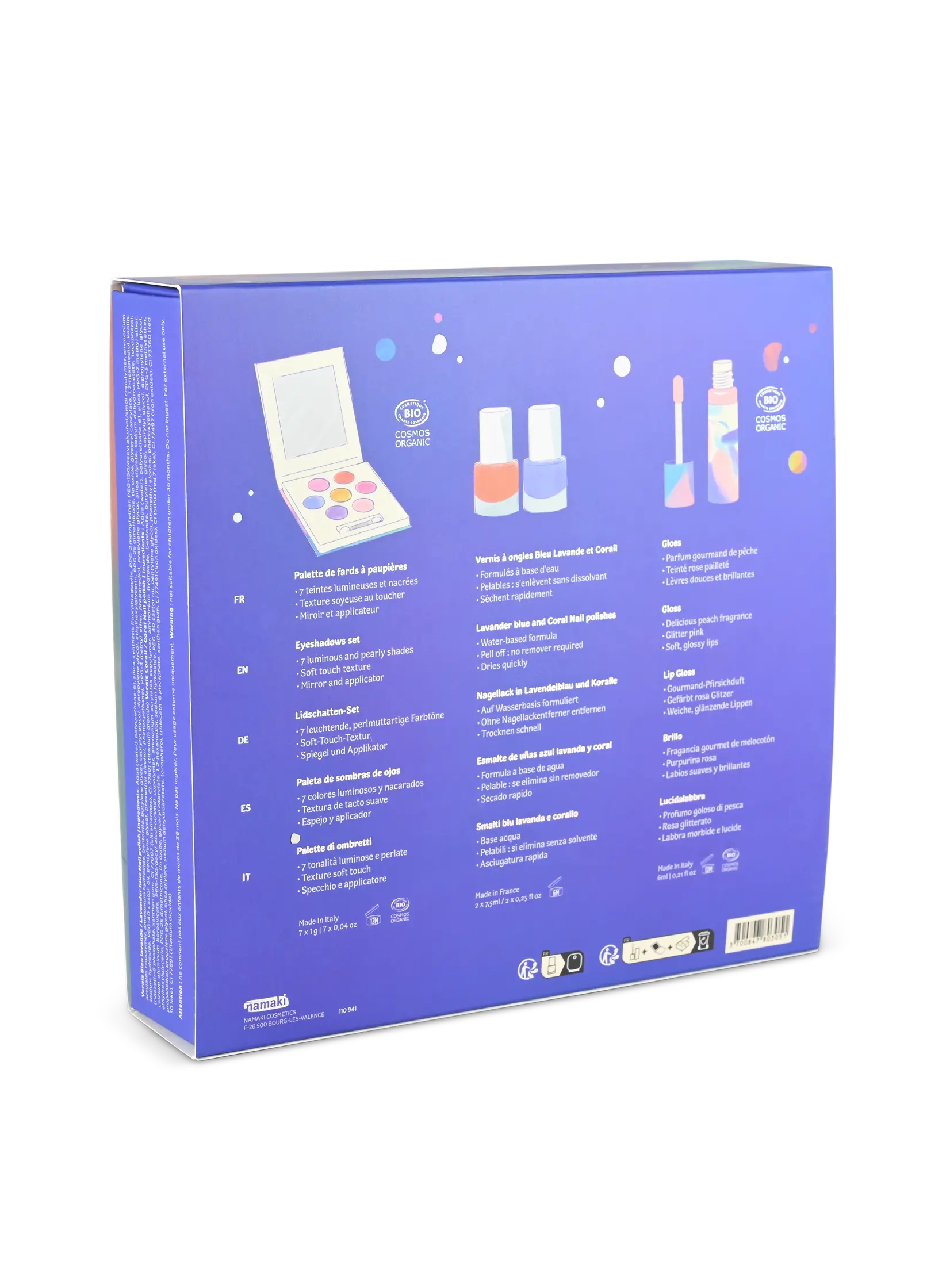 Plongez dans ce coffret tout en douceur et en poésie, idéal pour offrir un cadeau original et créatif. Que ce soit pour éveiller l’imagination des enfants ou pour ajouter une touche festive à une tenue, ce coffret est le choix parfait. La palette de fards à paupières, le gloss rose pailleté et les vernis à l’eau bleu lavande et corail se complète parfaitement pour créer des looks harmonieux. Un cadeau qui fera briller les yeux et permettra de s’amuser tout en beauté !