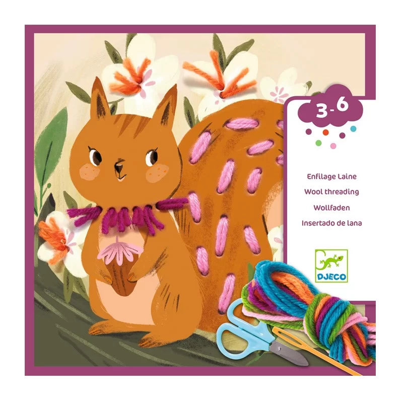 Enfilage laine Petit pas avec du fil permet de donner vie à des saynètes d'adorables animaux en utilisant la technique du filetage ! Dès 3 ans.