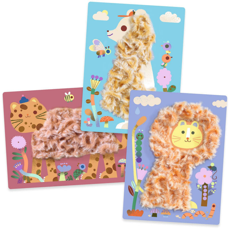 Une activité toute douce comme un doudou ! L'enfant crée le pelage d'animaux tout mignons en utilisant des brins de laine duvetée à poser sur des zones Velcro auto-agrippantes. A chaque animal sa couleur !