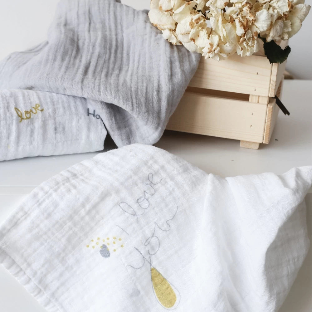 Ce joli lot de 3 langes au format 70x70 cm sera un indispensable dès les premières heures avec votre trésor ! On adore les coloris mixtes et les inscriptions remplies d'amour parsemées sur ces tissus tout doux !