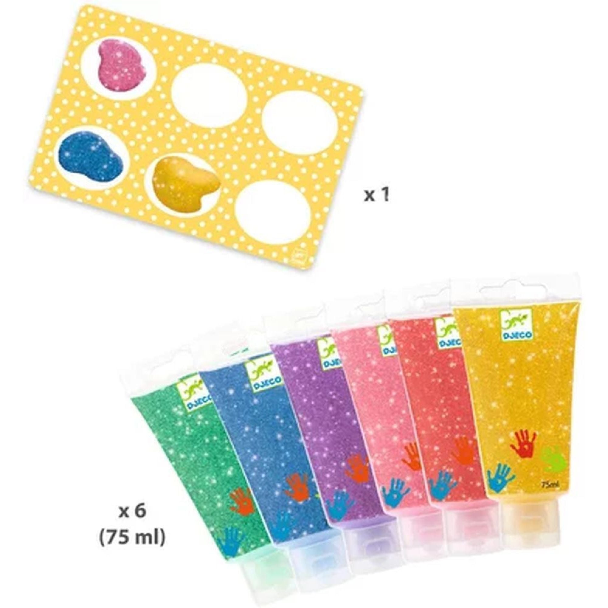 Découvrez ce joli lot de 6 tubes de peinture à doigts paillettes de la marque française Djeco. Ils ont été spécialement conçus pour être utilisés avec les doigts. Pratique, la peinture est lavable à l'eau en cas de tâches sur les vêtements. Idéal pour développer la créativité de vos enfants.